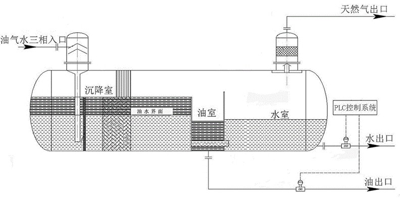三相分離器由分離筒體、捕霧器、布液板、反射板、聚結填料、分程隔板、導水管、液位計、安全閥、液位控制閥等附件構成,具有工藝簡單,投資少,便于管理和維護,指標穩定可靠的特點,有利于實現原油處理工藝密閉。